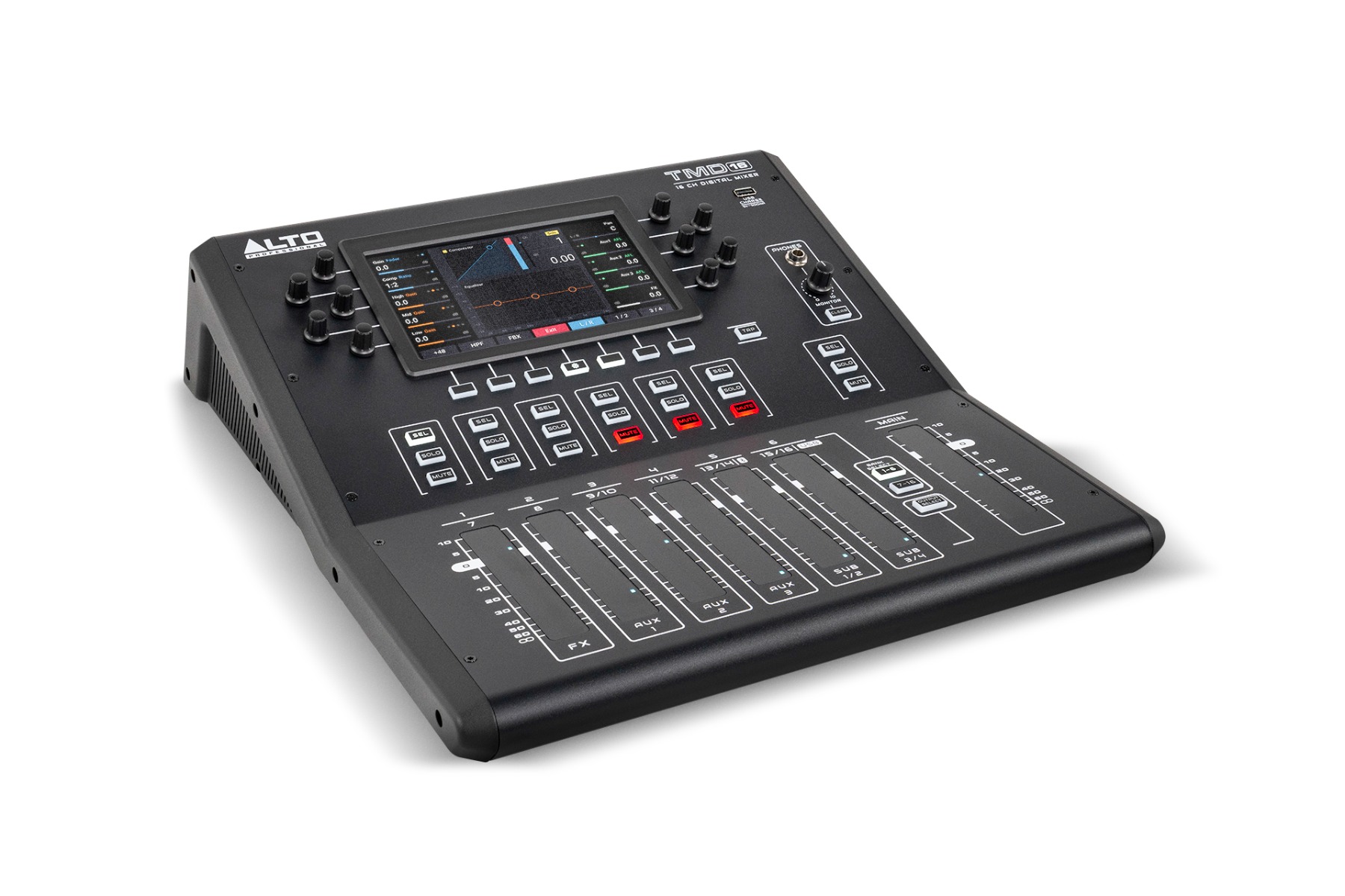 De ALTO TMD16 Digital Mixer is een krachtige 16-kanaals digitale mixer die live-optredens, repetities en evenementen eenvoudig maakt. Dankzij het intuïtieve ontwerp met backlit push-buttons, 100mm capacitive touch faders en dedicated encoders heb je volledige controle zonder diep in menu’s te duiken. Met ingebouwde effecten, parametric EQ, compressoren op alle ingangen en uitgangen en handige preset save/recall, levert deze mixer professionele geluidskwaliteit in een gebruiksvriendelijke vorm. Bluetooth-integratie en plug-and-play connectiviteit zorgen dat afspelen, livestreams en remote aanpassingen probleemloos verlopen.