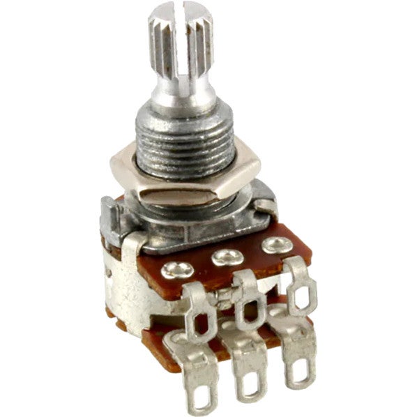 Dit is de Bourns 500K Blend/Balance Pot (geleverd per stuk). Het gaat om een 500K lineaire split shaft potmeter met een center detent, bedoeld voor elektrische en semi-akoestische gitaren met humbucker-elementen. Hiermee kun je bijvoorbeeld gelijkmatig je favoriete mix maken tussen de klanken van 2 gitaar pickups of de verhouding van de 2 spoelen van een humbucker variëren.