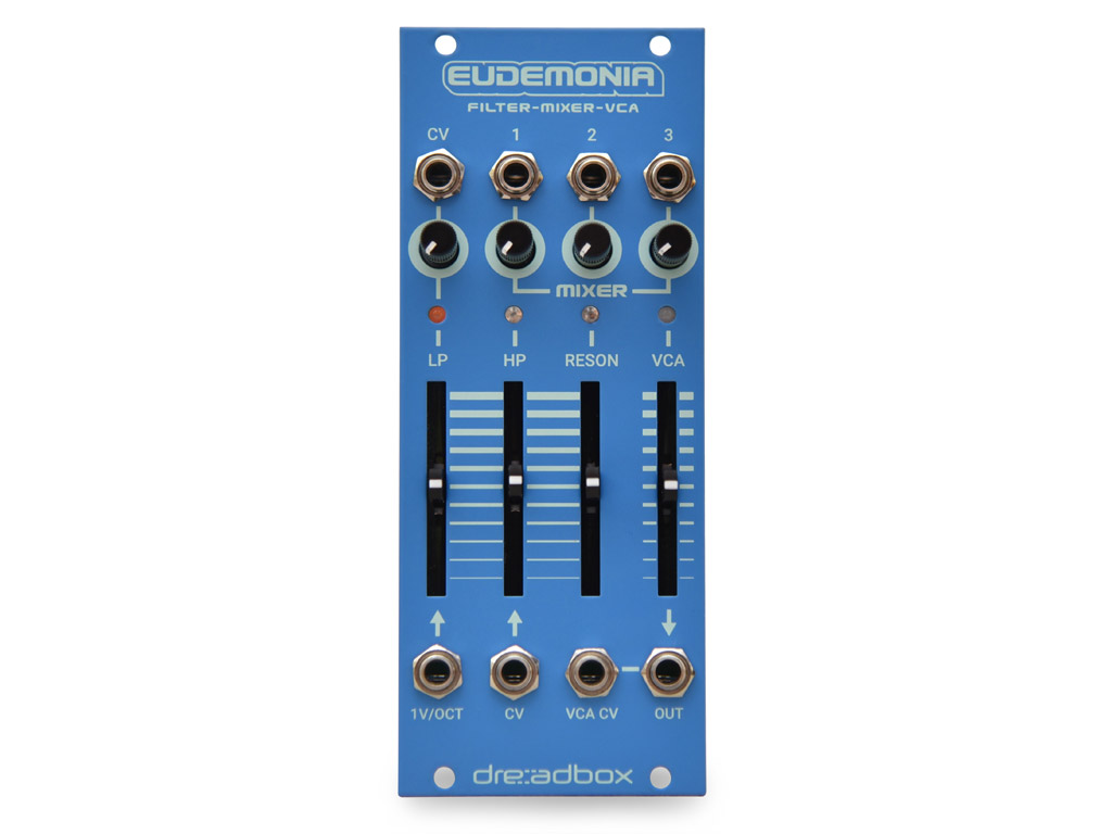 Deze Eudemonia is een multifunctionele module die niet alleen fungeert als analoog filter, maar ook tot wel 3 signalen kan mixen en over een VCA beschikt.
