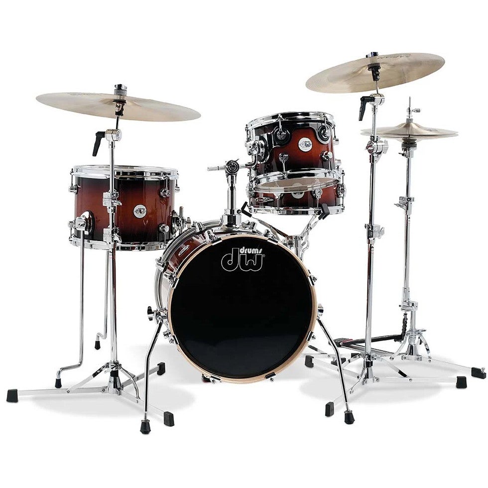 Met deze DW Drums Design Series Mini Pro haal je een gave 4-delige shellset in huis, met een erg kleine voetafdruk! De kit heeft namelijk een kleine bassdrum van 16 inch, een 10 x 6.5 inch hangende tom, een 13 x 9 inch floortom en ook een 12 x 5 inch snaredrum! De ketels zijn gemaakt van hoge kwaliteit Noord Amerikaans esdoornhout (maple), waardoor de kit een fijn allround geluid heeft. Door zijn compacte formaat, is deze kit uitermate geschikt voor de jonge beginner, maar juist ook heel geschikt voor de drummer die op niet conventionele manieren moet reizen!
