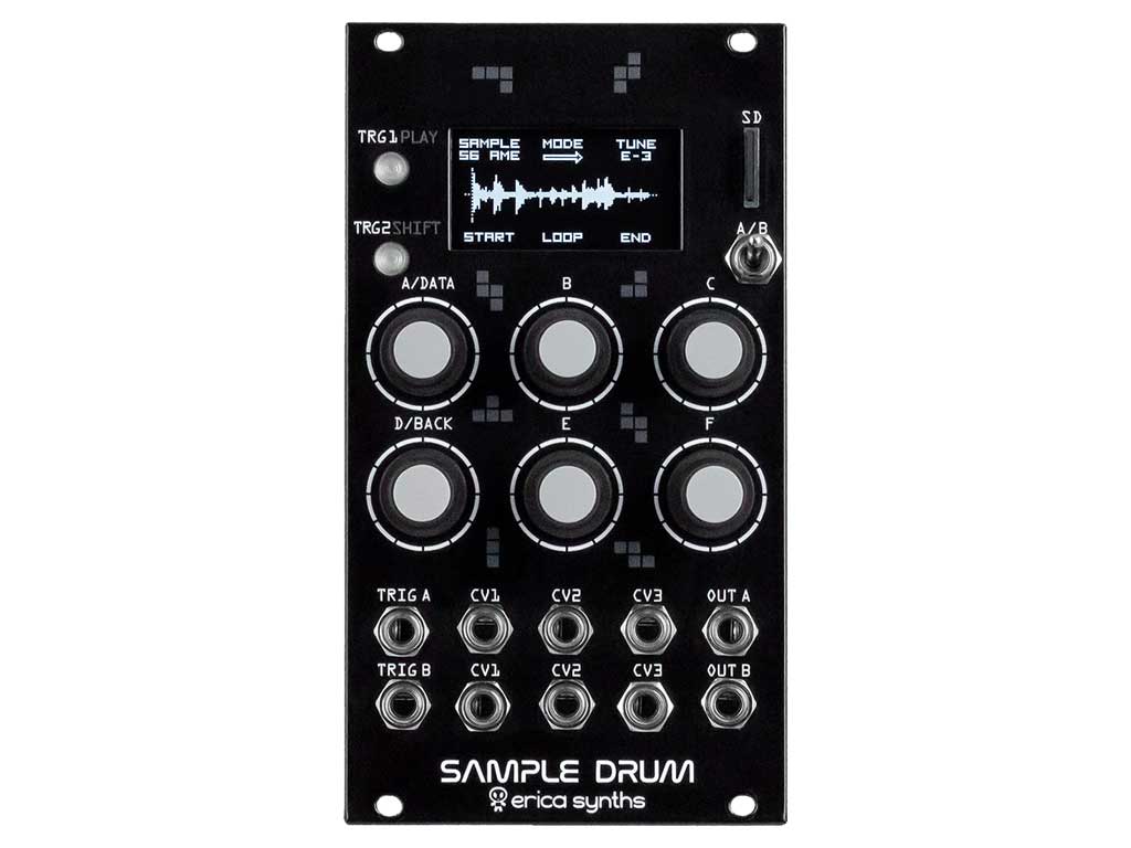 De Erica Synths Sample Drum is een 14HP Eurorack sample player module met een eenvoudige, intuïtieve interface en geweldige geluidskwaliteit, ontworpen met live performance in gedachten. De Sample Drum bestaat uit twee identieke delen en stelt je in staat om samples of loops direct in je modulaire systeem af te spelen, op te nemen en te slicen. Voor processing zijn er verschillende modus, afstemmingsfuncties (inclusief 1 V/Oct pitch tracking), virtuele VCAs plus AD envelopes en realtime effecten. Drie vrij toewijsbare CV-ingangen per kanaal garanderen diepere expressie tijdens jouw performance. 16-bits mono wav-samples worden vanaf een SD-kaart (een 16 GB SD-kaart met fabrieksvooraf ingestelde samples wordt meegeleverd met de module) in het RAM-geheugen geladen (32 MB / ~ 5 minuten opnametijd) voor directe afspeelrespons. Alle instellingen kunnen worden opgeslagen en opnieuw worden opgeroepen tijdens live optredens.