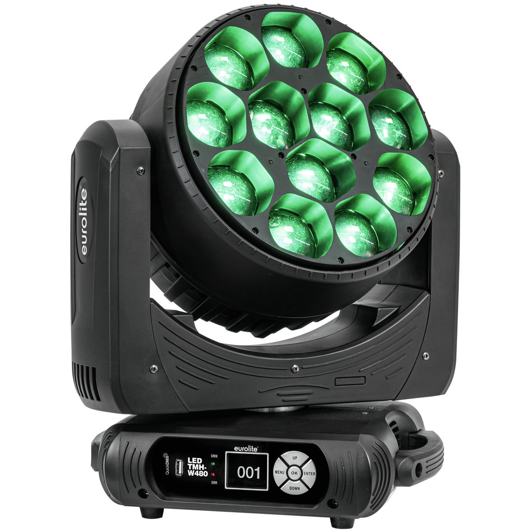 Deze LED TMH-W480 LED moving head van Eurolite beschikt over twaalf krachtige 4-in-1 RGBW LED’s van ieder 40 W. De LED’s laten zich uitstekend (traploos) mengen en zijn tevens individueel bedienbaar. Naast de wash-functie beschikt de moving head over een strobeoscoop. Qua bediening zijn er tal van mogelijkheden. Onder meer DMX, QuickDMX (draadloze DMX via een los verkrijgbare USB dongle), W-DMX (draadloze DMX via een los verkrijgbare USB dongle), sound-to-light via de ingebouwde microfoon, stand-alone en een master/slave-functie. Vanwege de volledig knippervrije operatie van de fixture, is hij prima in te zetten voor videotoepassingen. Wanneer je de moving head in stand-alone modus zet, wordt gebruik gemaakt van de programma’s die zijn voorgeprogrammeerd in Light Captain. De lamp wordt gekoeld op twee verschillende manieren; bij de kop gebeurt dit middels een temparatuur gestuurde ventilator en bij de basis werkt dit middels een stille ventilator.