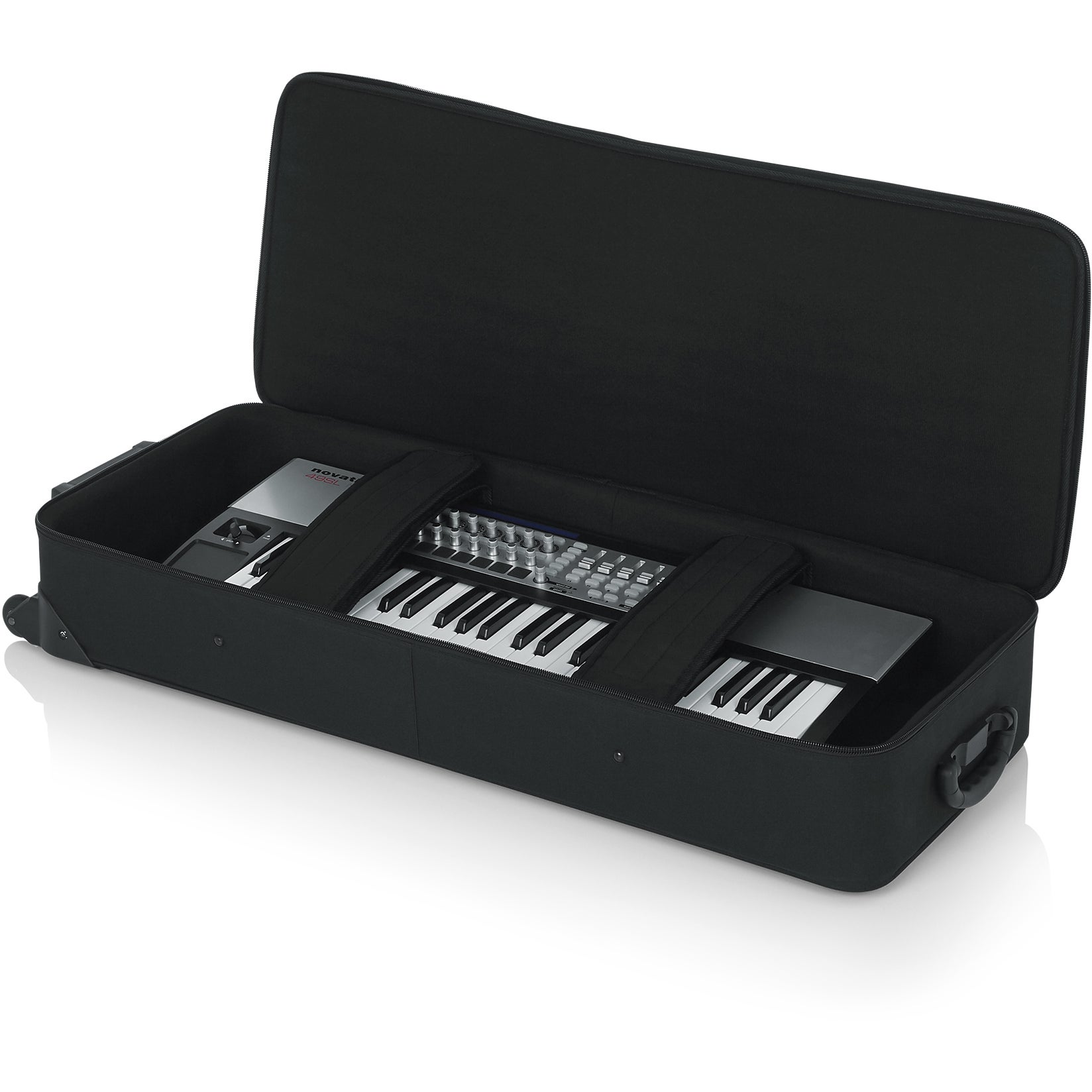 De Gator Cases GK-49 keyboardtas is speciaal ontworpen voor keyboards met 49 toetsen. Dankzij de lichtgewicht Rigid EPS Foam en de robuuste nylonconstructie met een polyethyleen-versterkt binnenframe biedt deze tas optimale bescherming tegen stoten en schokken. De binnenzijde, bekleed met tricot en zacht schuim, heeft royale afmetingen van ongeveer 97 x 38 x 14 cm, zodat je keyboard met 49 toetsen optimaal past. Dankzij de volledig verstelbare, gevoerde riemen blijft je keyboard tijdens het transport stevig op zijn plek. Daarnaast beschikt de tas over ruime buitenvakken voor pedalen en kabels. De ingebouwde wielen en het trekhandvat zorgen voor moeiteloos vervoer van je keyboard. Bovendien beschermen de skidbars tegen krassen, zodat je keyboardtas nog lang meegaat.