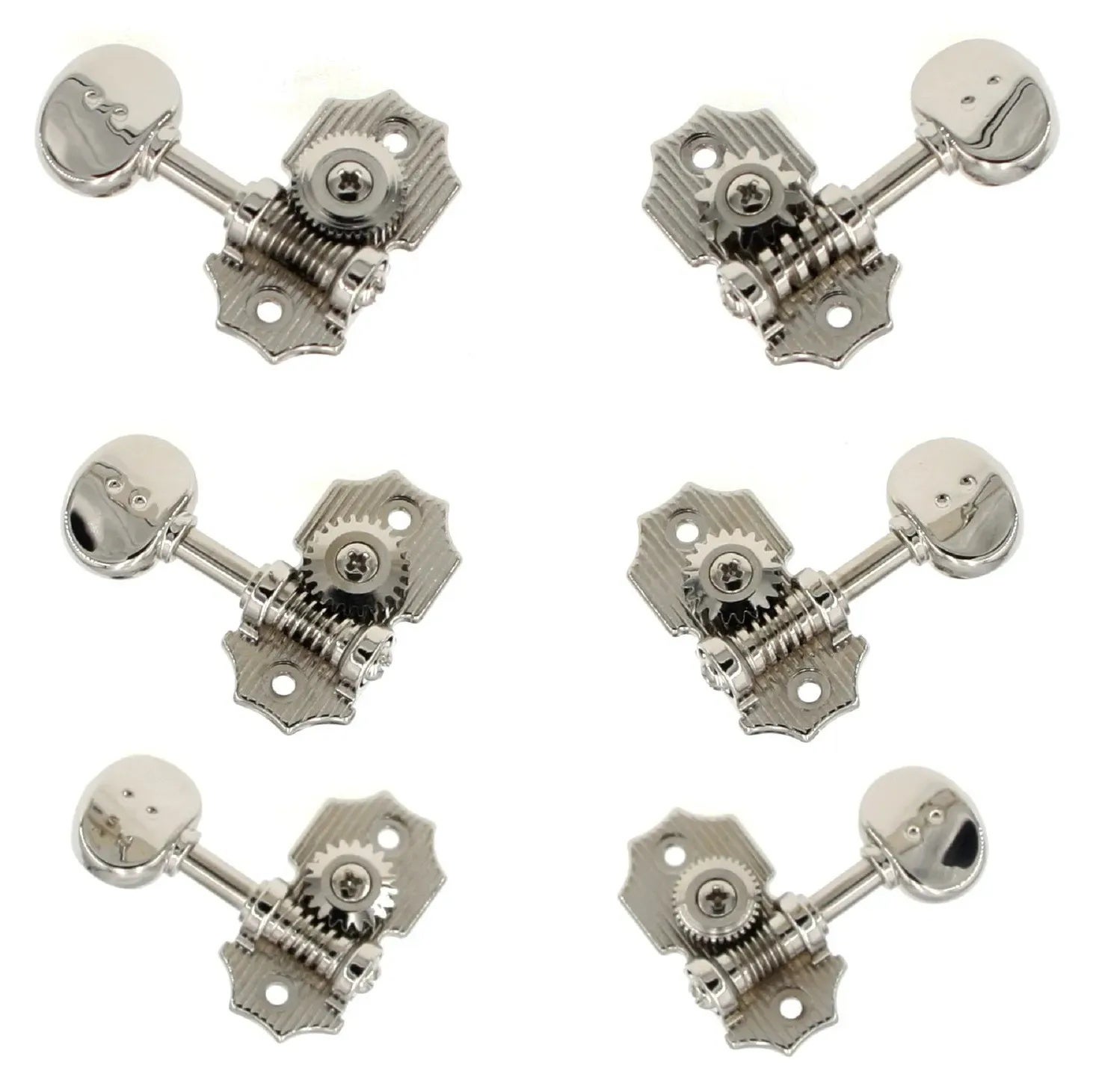 De Graph Tech PRN-4324-N0 machineheads zijn ontworpen voor elektrische gitaren met een retro vintage look. Dankzij de open constructie en het vintage waffle-back design passen ze perfect op gitaren met 11/32″ peghead holes. Elke machinehead heeft een specifieke gear ratio voor zijn snaar, waardoor een halve draai van de knop resulteert in een halve toon verandering. Zo stem je elke snaar sneller en nauwkeuriger. De set bestaat uit 6 machineheads (3 links, 3 rechts) en heeft een stijlvolle nickel finish.