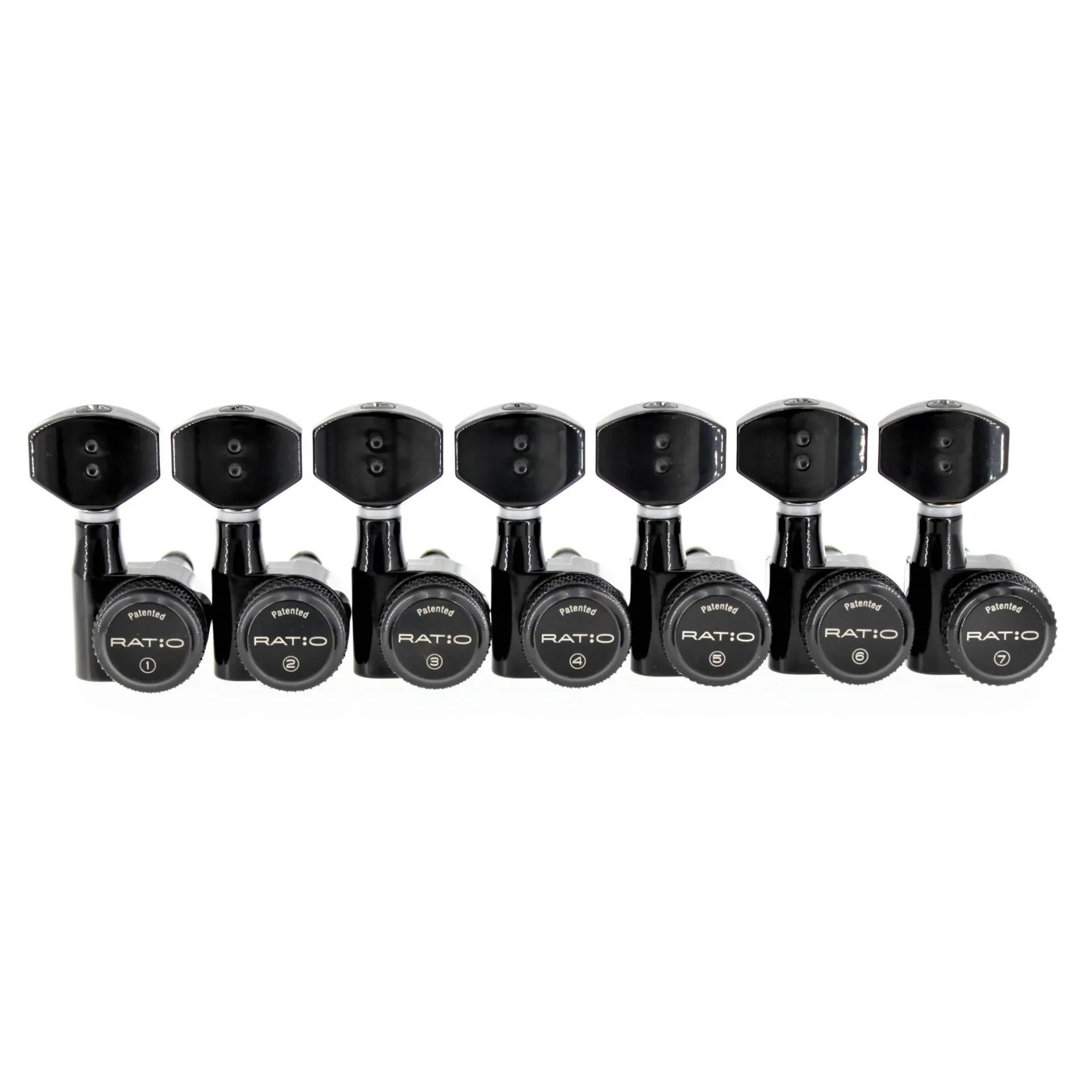 De Graph Tech PRL-8721-B7 Ratio Electric Locking Machine Heads zijn ontworpen voor 7-snarige elektrische gitaren met een 7-in-line configuratie aan de basszijde (links). Elk van de stemmechanismen heeft een uniek overbrengingsratio, waardoor het stemproces voor elke snaar sneller en preciezer wordt. De mini contemporary knoppen bieden een modern design, terwijl het vergrendelmechanisme met een duimwieltje de snaren stevig op hun plek houdt. De machine heads zijn makkelijk te installeren met de meegeleverde InvisoMatch montageplaten die compatibel zijn met bestaande schroefgaten.