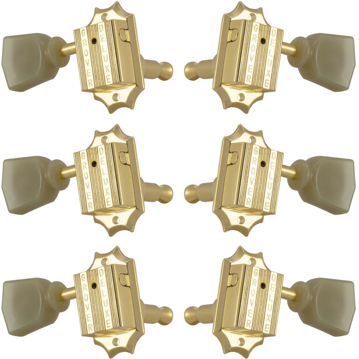De Grover 135G vintage stemmechanieken bieden een hoge kwaliteit en retrostijl voor gitaristen die op zoek zijn naar precisie en stabiliteit. Deze set bestaat uit 6 mechanieken: 3 voor de linker- en 3 voor de rechterkant van de gitaar. Met een 14:1 vertaalverhouding kunnen de snaren nauwkeurig gestemd worden. Het stevige gegoten behuizingsontwerp en de trapezvormige plastic knoppen zorgen voor langdurige prestaties. Het gouden afwerkings geeft de mechanieken een klassieke uitstraling die bij elke vintage gitaar past.