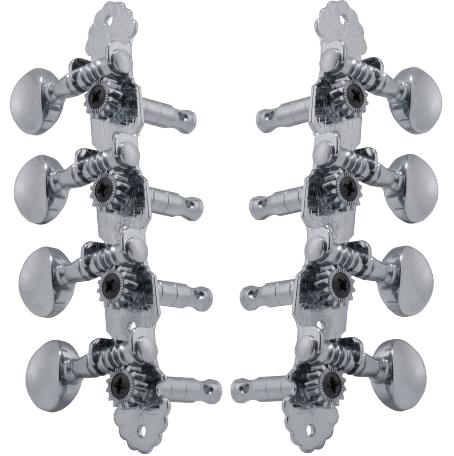 De Grover 304C Sta-Tite mandoline stemmechanieken bieden een klassieke stijl en topkwaliteit voor je mandoline. Het 4-on-a-plate ontwerp en de nauwkeurig afgewerkte gravure op de metalen platen zorgen voor een verfijnde uitstraling. De ronde metalen knoppen bieden zowel een stevige grip als esthetisch plezier. De koperen tandwielen garanderen perfecte vertanding voor een soepele stemming. Dankzij de 14:1 vertanding kun je je mandoline met precisie stemmen, terwijl de robuuste metalen assen en chromen afwerking zorgen voor langdurige duurzaamheid.