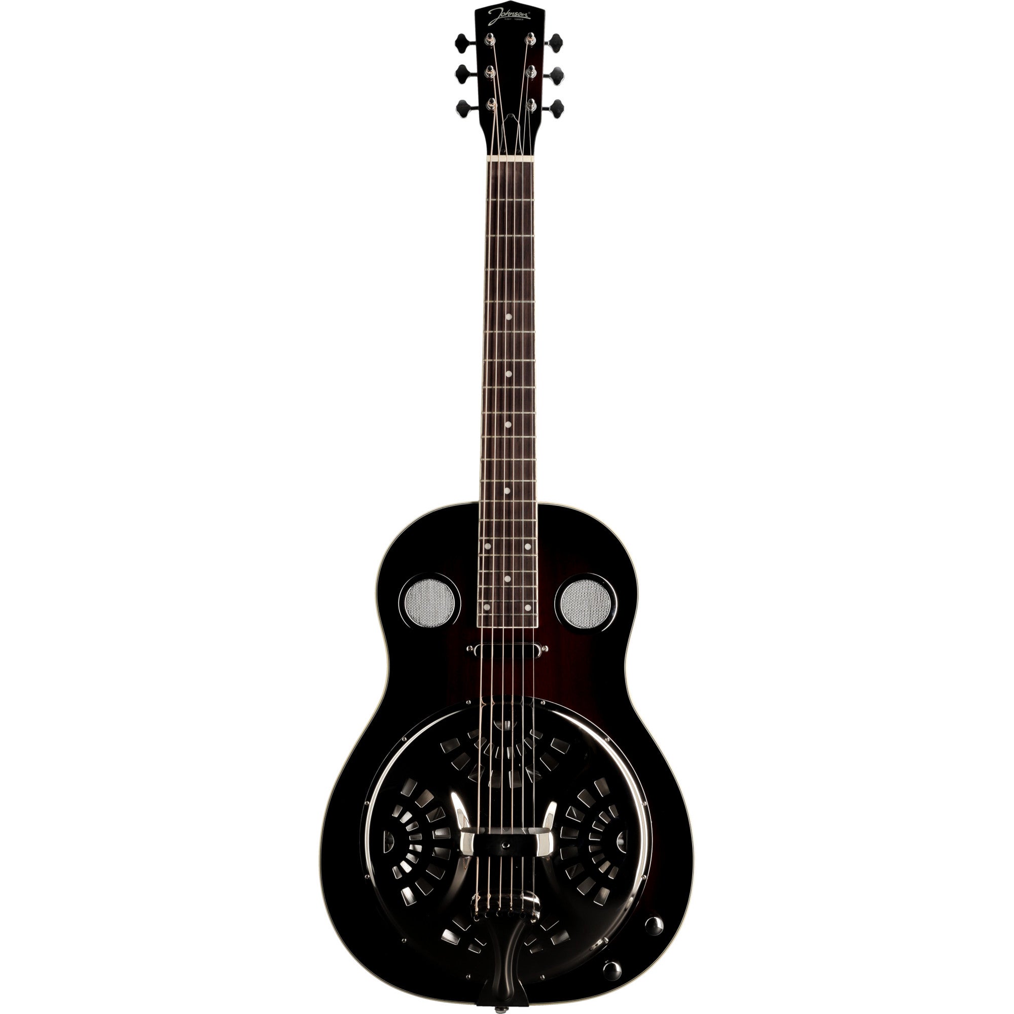 De Johnson JR-850E-SB resonatorgitaar heeft een mahonie body en hals, met een palissander toets en afgewerkt met een Sunburst Gloss finish. Deze gitaar heeft een zogenaamde spider cone, de brug wordt ondersteund door een spinvormige constructie die verbonden is met de conus en door zijn vorm voor extra sustain zorgt. Je kan deze gitaar akoestisch bespelen, maar ook aansluiten op een versterker. Er zit een enkelspoel (single coil) element bij de hals, volume en toon regel je met draaiknoppen op het bovenblad.