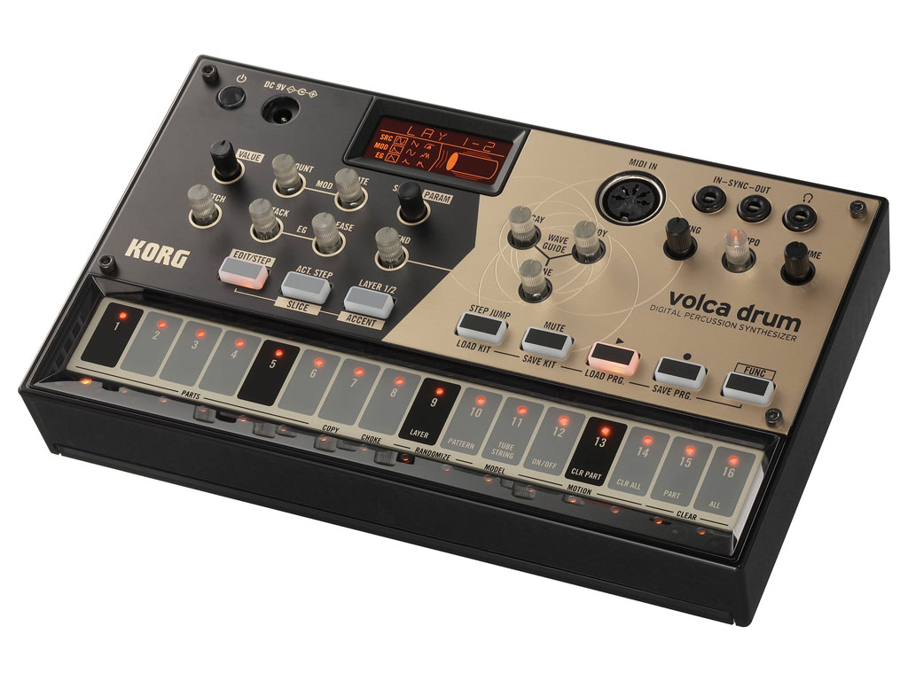 De Korg Volca Drum is een digitale percussie synthesizer in het welbekende compacte formaat van de Korg Volca instrumenten. De Volca Drum maakt voor het creëren van zijn drumgeluiden gebruik van DSP-powered analog modeling. Er zijn dan ook meerdere oscillator waveforms aanwezig waarmee realistische en minder realistische drumgeluiden kunnen worden gegeneerd, maar naast drumgeluiden is er nog veel meer mogelijk me deze synthesizer… Er zijn 6 delen aanwezig, ieder met 2 'layers' die beide op dezelfde manier te editen zijn. Ook heeft de Volca Drum een 16 staps sequencer, met een paar interessante nieuwe functies. Ook niet onbelangrijke is het overzichtelijke uiterlijk van de Volca Drum, er is zelfs een handig LCD display aanwezig waarop je goed kunt zien wat je doet. Als kers op de taart heeft hij ook nog een leuke 'Random' functie en heeft hij sync in- en uitgangen waardoor hij ook perfect te gebruiken is met je favoriete DAW. Al met al een leuke,