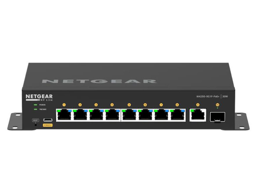 De Netgear M4250-9G1F-PoE+ Netwerkswitch is ontworpen voor 1G AV over IP met veelzijdige montageopties voor onder een tafel of achter een scherm. Vooraf geconfigureerd voor kant-en-klare functionaliteit.