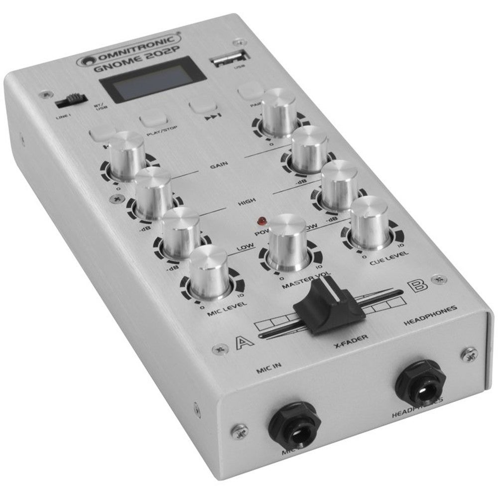 De Omnitronic Gnome-202P Mini Mixer is een zeer compacte 2-kanaals DJ-mixer met Bluetooth en MP3 speler. Deze pocket mixer heeft een crossfader en aansluitmogelijkheden voor een microfoon en een koptelefoon. Er zijn twee master outputs (RCA) en de stereokanalen hebben ieder gain control en een twee bands EQ. En dit alles in een kleine, degelijke metalen behuizing.