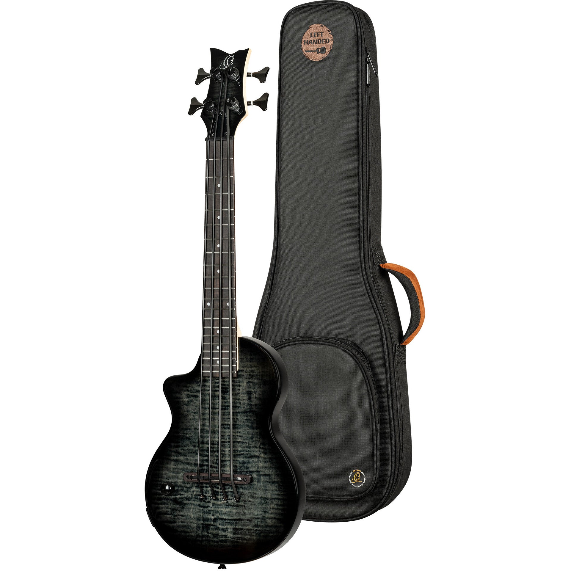 De Ortega Neo Series NEO-BS-TGB-L is een mooie, linkshandige, elektrische bas ukelele met een mensuur van 512 mm, ideaal om overal mee naartoe te nemen of als je iets kleinere handen hebt. De body is van okoume en werd prachtig afgewerkt met een esdoorn bovenblad waarin natuurlijke houttekeningen zichtbaar zijn (flamed maple). De purple heart toets en de matzwarte diecast tuners maken het strakke design af en geven deze bas een stijlvolle uitstraling. De ingebouwde Ortega Magus Express preamp werkt met een oplaadbare batterij, de nodige USB-C laadkabel wordt meegeleverd, net als een stevige gigbag.