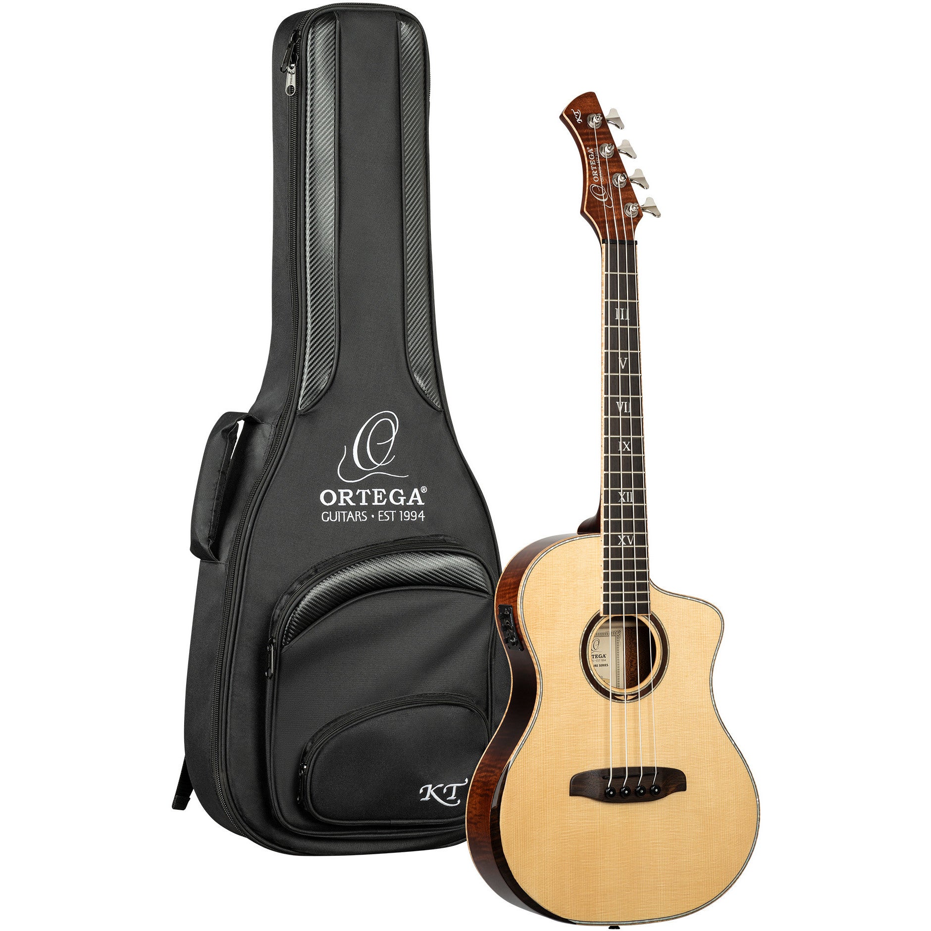 Deze Ortega Signature Series KT-WALKER-V3 short scale elektrisch-akoestische bas werd ontworpen in samenwerking met Ken Taylor, bassist bij Peter Maffay en gerenommeerd sessiemuzikant. Het massieve, sparren bovenblad zorgt niet alleen voor een helder geluid, het lichte hout contrasteert erg mooi met de donkere zij- en achterkant van mahonie met prachtig houtmotief (flamed mahogany). De mother of pearl bindingen en de signature headstock met chrome Ortega OTMEB tuners zorgen voor de afwerking. Je kan deze bas zowel akoestisch als versterkt bespelen, de Ortega MagusX/B werkt met een oplaadbare batterij en heeft zowel toon- en volumeregeling als een ingebouwde tuner aan boord. De hals is van nato hout en kreeg een palissander toets met mooie, ingelegde Romeinse cijfers als positiemarkeringen. Een Signature gigbag is in de prijs inbegrepen.