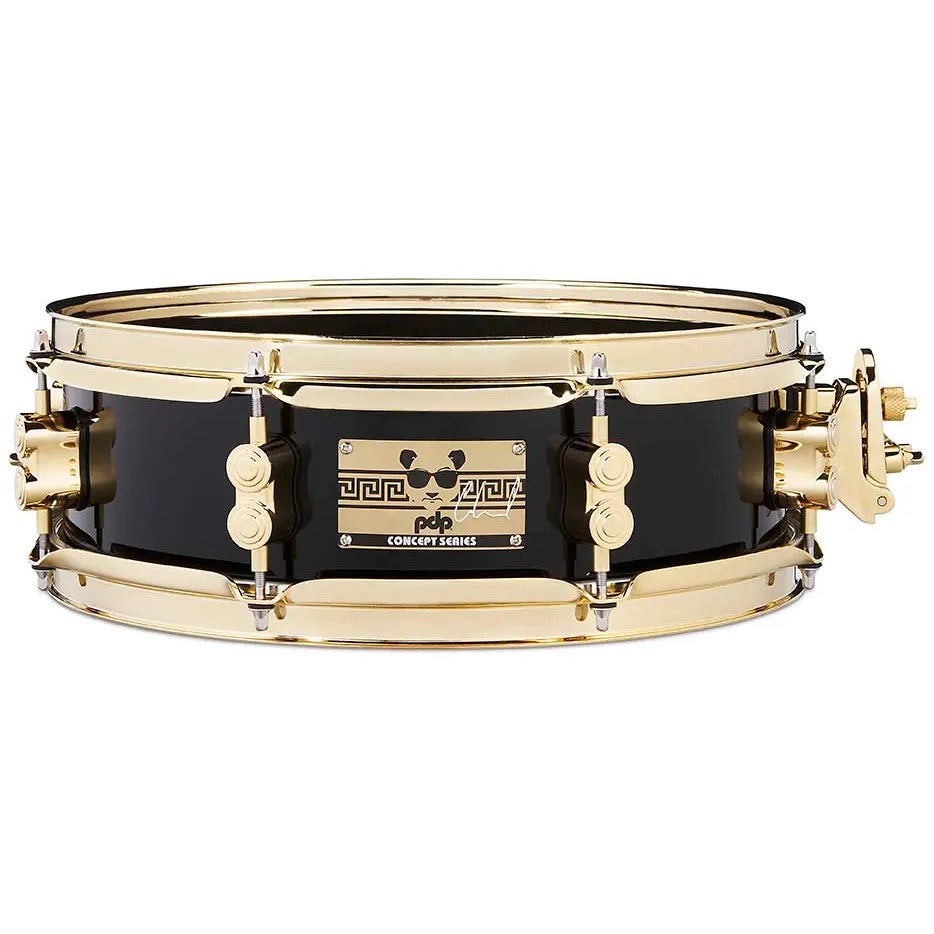 Als je de drummer bent van Bruno Mars, kun je maar beter zorgen dat je een toffe snaredrum hebt! Deze PDP Eric Hernandez Signature snaredrum heeft een diameter van 13 inch en een diepte van 4 inch en staat centraal in de muziek van Bruno Mars. Het ondiepe formaat kan je zien als een ‘piccolo’ formaat en zo klinkt deze snare dan ook. De ketel is gemaakt van 10 lagen Europees esdoornhout en levert een erg tasty, lekkere korte sound waar elke pop drummer ongetwijfeld vrolijk van wordt. Met zijn 13 inch is deze snare ook te gebruiken als een side-snare. Bijzonder aan deze snare is met name de gave gold-plated ketelhardware en Eric Hernandez z’n signature E-Panda logo batch!