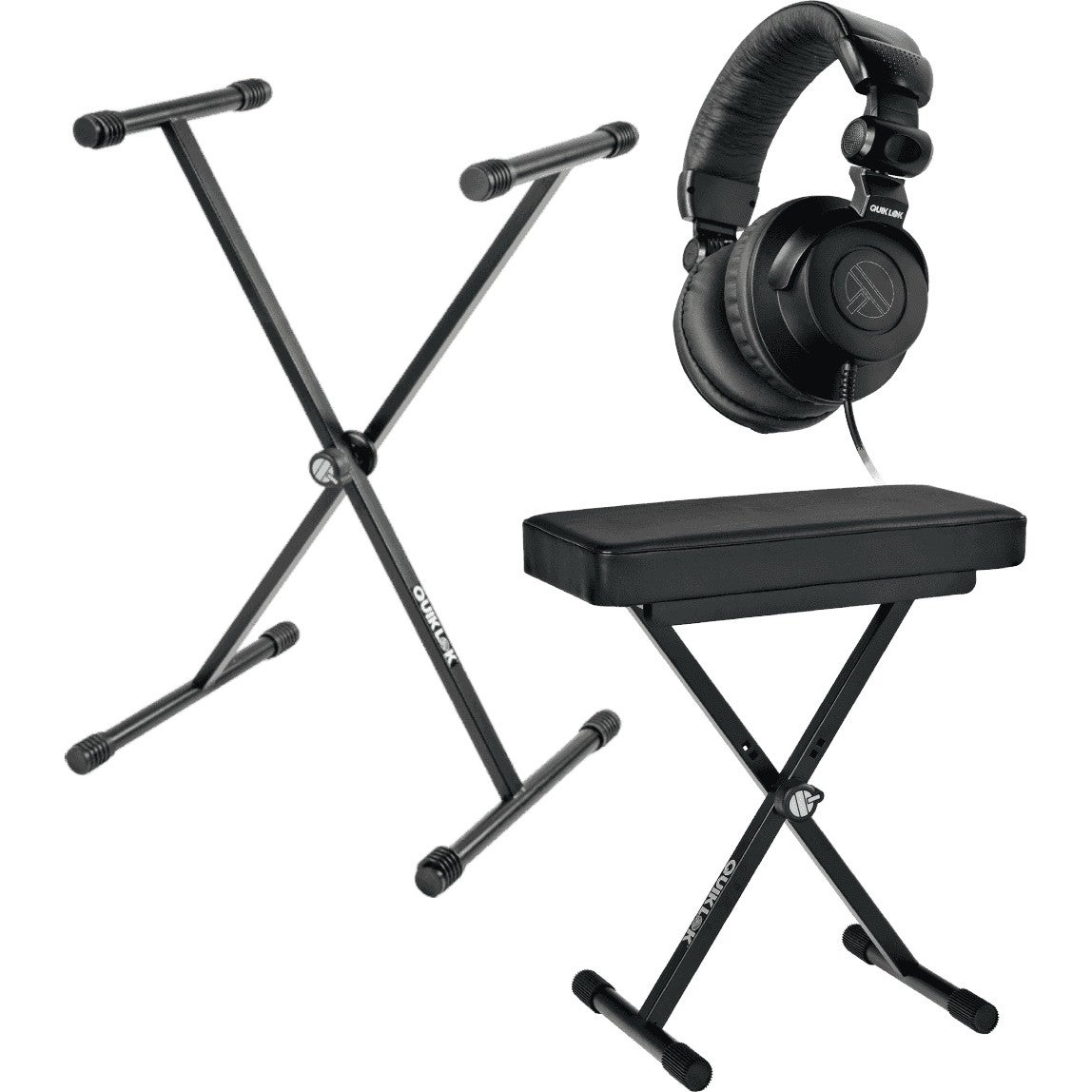 Accessoires nodig om keyboard te spelen? Met de KEYBUNDLE1-BK van Quiklok schaf je meteen een handige startersset aan bestaande uit een T10 keyboardstand, een zwart BX8 bankje en een HP10 hoofdtelefoon. De X-vormige keyboardstand is enkelvoudig en kan in de hoogte versteld worden, evenals het bankje. Dit bankje kan tot 112 kilogram dragen en is uitgerust met een lekker dik kussen om comfortabel te zitten. De gesloten hoofdtelefoon garandeert je een nauwkeurige weergave van je geluid door de drivers van 50 millimeter en is goed geïsoleerd zodat je niet hoeft te vrezen voor ruis. De kabel is 3 meter lang en dus geschikt voor veel situaties. Door de impedantie van 32 ohm kan je de koptelefoon aansluiten op je smartphone of tablet.