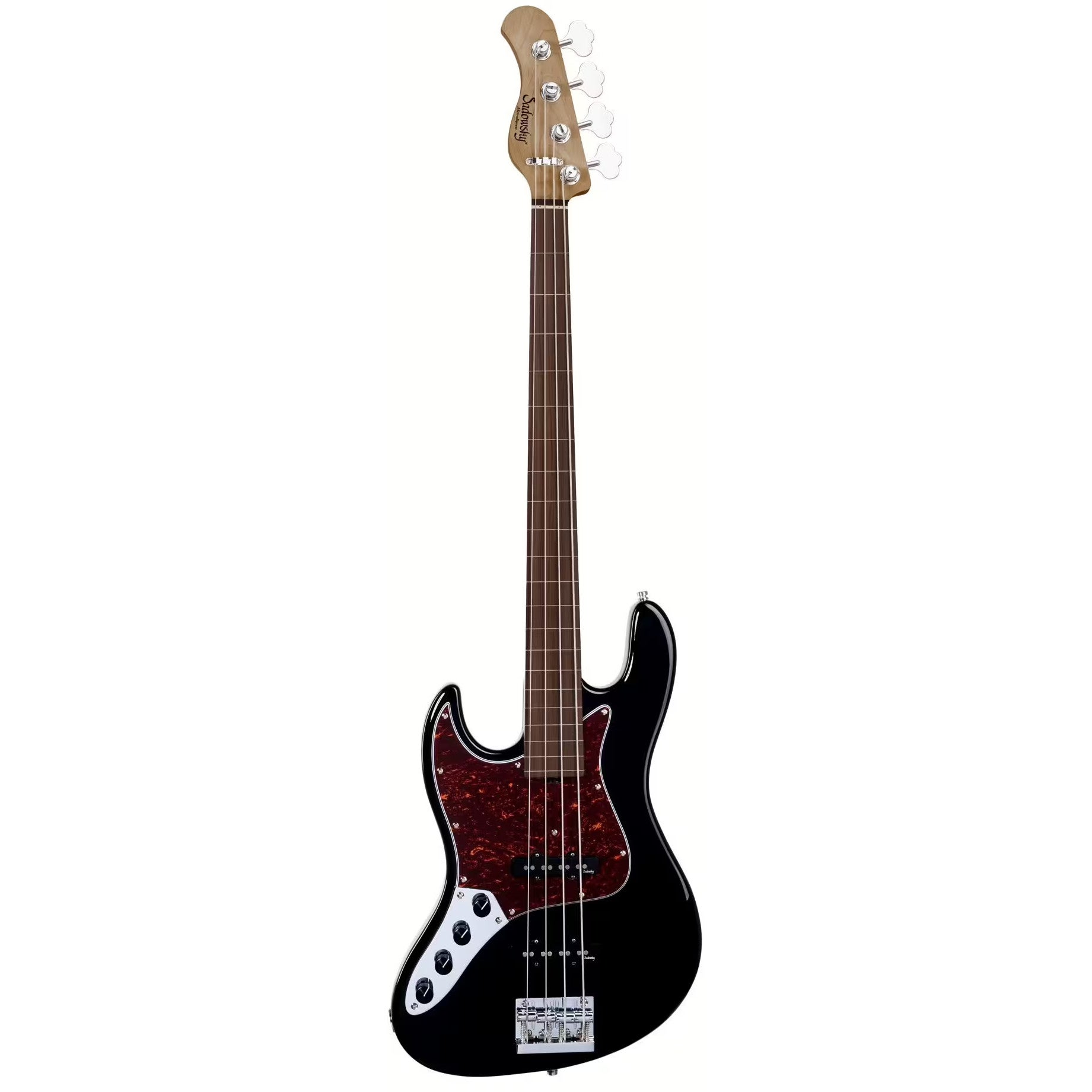 Met de Sadowsky MetroExpress Vintage J/J Bass Morado fretless haal je een kwalitatieve, linkshandige elektrische basgitaar in huis zonder frets. Door okoume hout te gebruiken voor de body is dit een licht instrument. Dankzij de maple hals, morado toets en lichtgewicht stemmechanieken van Sadowsky speelt deze basgitaar comfortabel, ook wanneer je langer op een podium moet staan. De passieve, hum-cancelling J-Style pickups en de elektronica van Sadowsky garanderen je een geweldige klank met krachtige bassen, stevige middentonen en luchtige hogere tonen. Volume, balans, treble en bas kan je zelf naar wens instellen via de knoppen en de bass-knop heeft een push/pull-functie voor preamp-bypass. Dit model is uitgevoerd in Solid Black met een tortoise slagplaat en markeringen op de toets. Inclusief PortaBag gigbag met rugzakriemen.