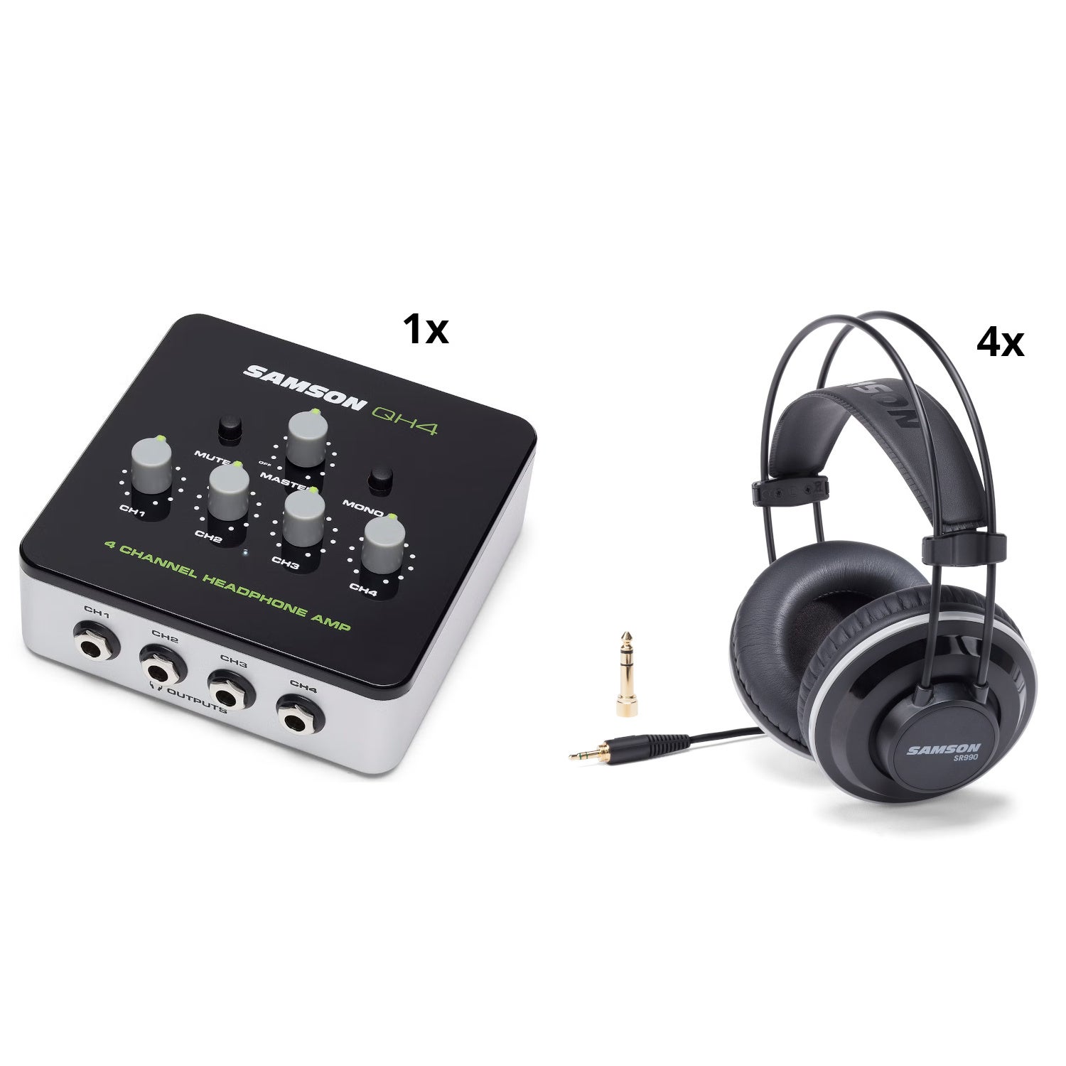 De Samson SR990 vierdelige set + QH4 hoofdtelefoon versterker is een mooie combinatie voor bijvoorbeeld een beurs. Je hebt iets te laten horen (bijvoorbeeld een CD of – wie weet – een keyboard of synthesizer. Met deze set kun je vier personen laten luisteren naar dezelfde bron, met voor ieder een eigen volumeregelaar. Ook in de muziekstudio kun je er iets nuttigs mee doen, ook daar zou je met z’n vieren naar dezelfde bron kunnen luisteren (bijvoorbeeld ter beoordeling van een mix).