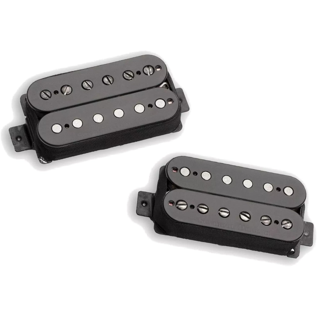 Dit is de Seymour Duncan Pegasus Sentient Humbucker Pickup Set Black (geleverd per 2 stuk). Het gaat om 2 passieve high dubbelspoels elementen, bedoeld voor elektrische gitaren met een humbucker in de brug én in de hals. Deze elementset is vooral ontwikkeld om moderne metalgenres en aanverwante progressieve stijlen mee te spelen. Hoewel deze gitaarpickups oorsponkelijk ontwikkeld zijn voor gitaren met meer snaren, een langere mensuur en/of een lagere stemming, zijn beide alnico 5 humbuckers ook uitstekend te plaatsen in een standaard gestemde 6-snarige solidbody. Van harmonische rijke, doch strakke brugsounds waarbij je akkoordgeluiden prettige opbloeien tot vintage warme halsklanken met genoeg strakheid en dynamiek ligt allemaal binnen handbereik. Dit geldt overigens zowel voor vervormde als cleane gitaarsounds. Om ongewenste feedback tegen te gaan, hebben beide elementen een vacuüm wasbehandeling ondergaan. Door de 4 aders van de kabels kun je bovendien beide humbucker