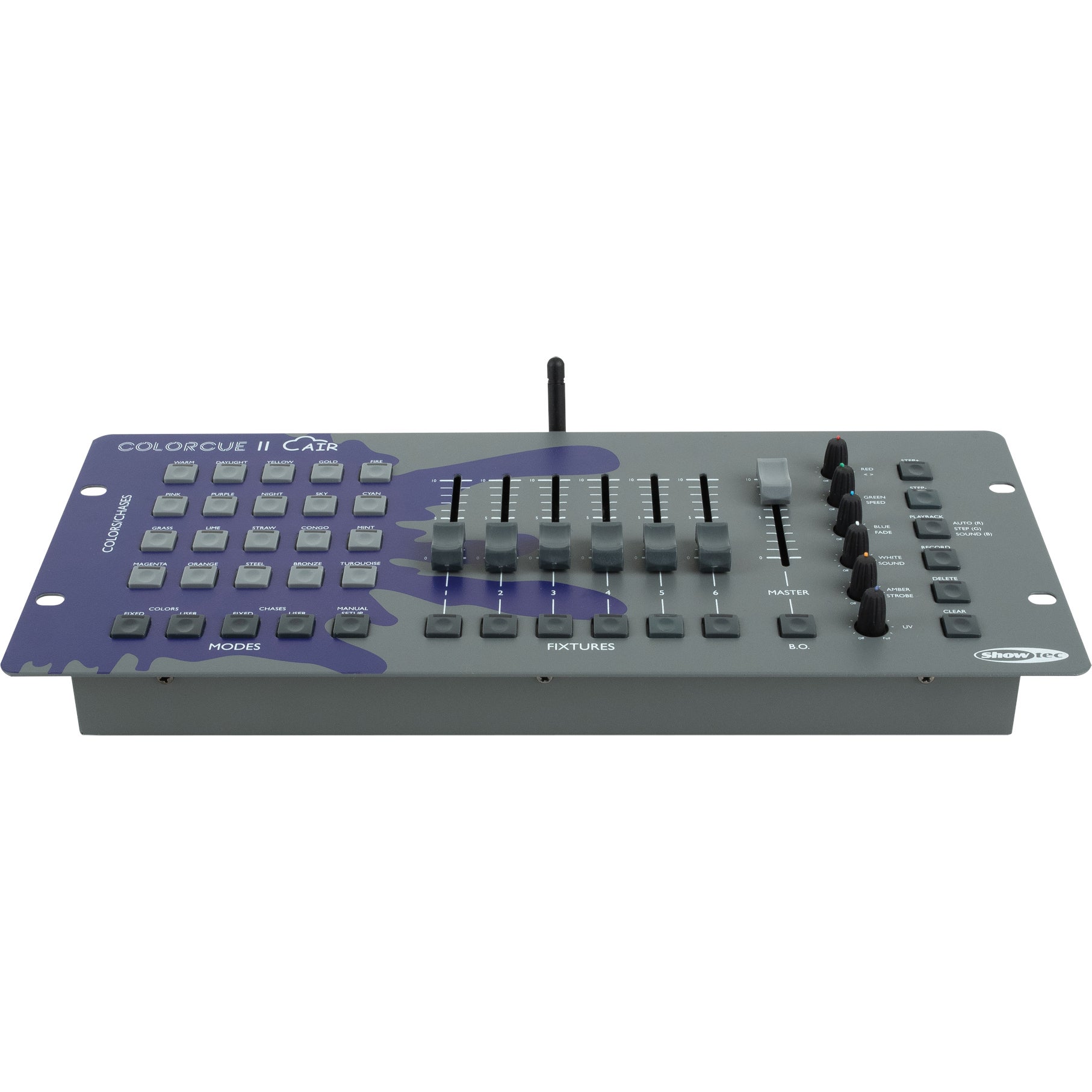 Hét hoogtepunt van draadloze LED DMX-besturing, ontworpen om moeiteloos je verlichtingservaring te verbeteren: de ColorCue 2 van Showtec. Met precisie en innovatie ontwikkeld, is de ColorCue 2 Air een intelligente controller met 6 faders en 36 kanalen, die naadloze draadloze controle biedt over LED-armaturen met maximaal 6 kleuren (RGBWA-UV), waardoor het perfect is voor elke locatie. Met zijn intuïtieve ontwerp plaatst de ColorCue 2 Air de kracht van nauwkeurige kleurregeling binnen handbereik. Met 6 potentiometers kun je moeiteloos de verlichting afstemmen om de gewenste kleur te bereiken, of het nu gaat om een eenvoudige 3-kleurige RGB-combinatie of een uitgebreid 6-kleurig RGBWA-UV-spectrum. Bovendien kun je met de ColorCue 2 Air je eigen palet samenstellen met 20 vooraf ingestelde kleuren, terwijl je ook de flexibiliteit hebt om te kiezen uit 20 vaste kleuren om elke stemming of sfeer te passen.