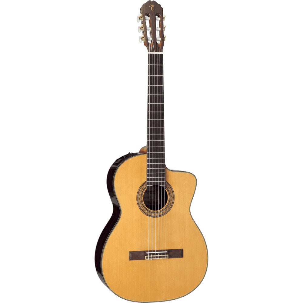 Deze Takamine elektrisch-akoestische gitaar is gebouwd met een massief ceder bovenblad en massief Indisch palissander aan de zij- en achterkant. Dit zorgt voor een warme, resonante toon met uitstekende projectie. De mahonie hals met een palissander toets ligt comfortabel in de hand en heeft een klassieke vlakke radius. Dankzij de hoogglans afwerking straalt de gitaar pure klasse uit.